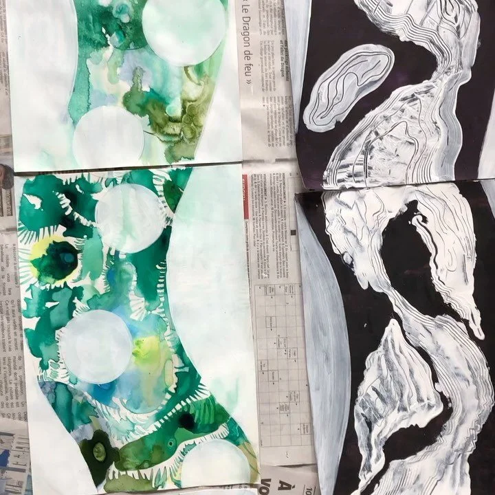 Separated by oceans and several time zones, the cousins designed a format allowing them to create together from different locations. Loosely inspired by the surrealist art game “Exquisite Corpse,” they conceived connecting paper panels exchanged via email. Each scroll is a total collaboration, having both created alternating sections in response to the other’s art.